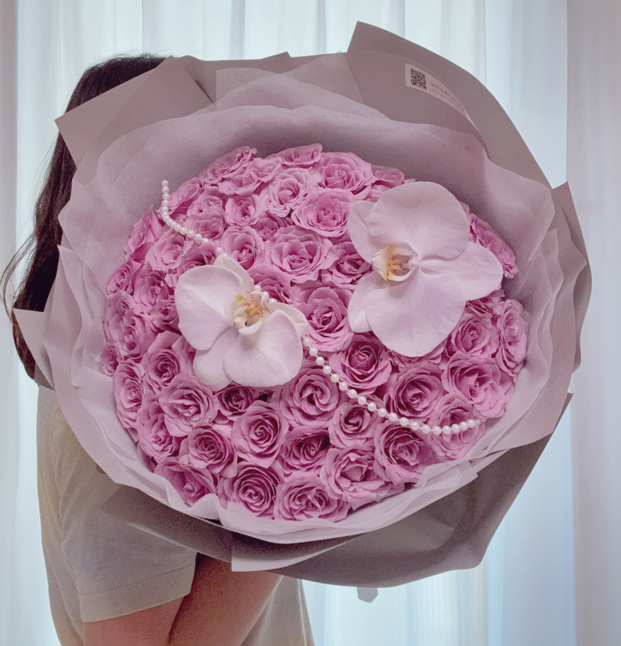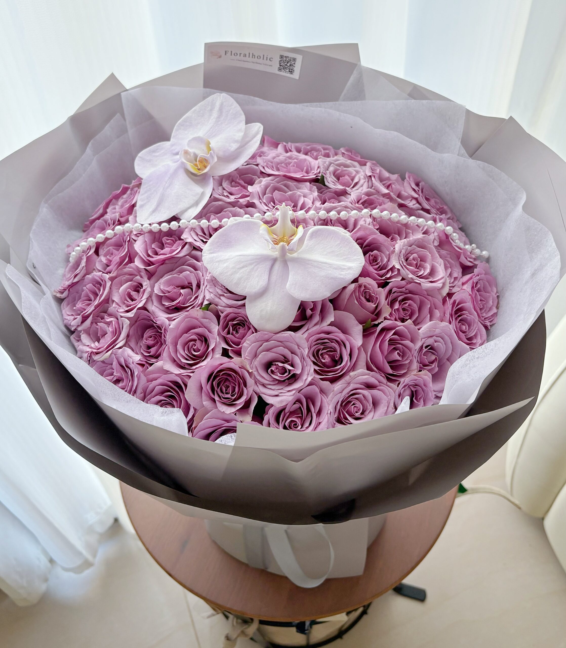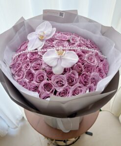 Lavender Elegance,” a stunning bouquet that captures the essence of grace and charm. Featuring delicate lavender roses intertwined with elegant white orchids, this arrangement is perfect for any occasion, whether it’s a heartfelt gift or a decorative centerpiece.